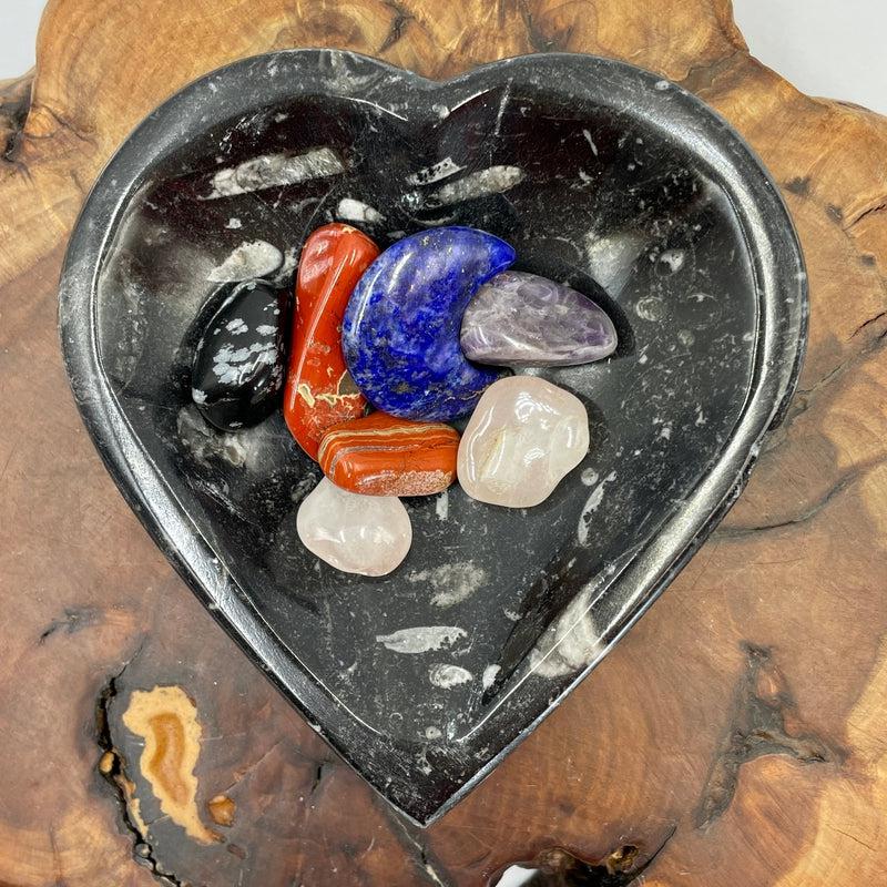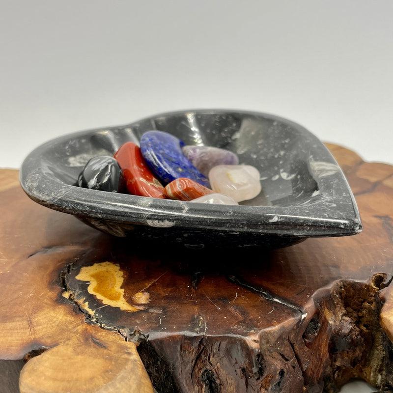 These Orthoceras Heart Dish is a striking fossil specimen to add to your collection. This specimen dish is polished and has unique Orthoceras fossil patterns. Each dish will be unique and makes a great gift to hold small trinkets and more!
